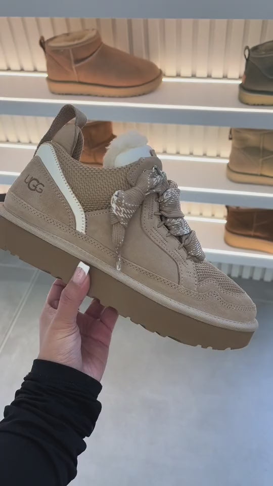 The UGG brand, founded in California in 1978 and famous for its iconic sheepskin boots that symbolize a comfortable and relaxed lifestyle, has expanded its offerings to include footwear beyond its classic line, such as the Lowmel model. The UGG Lowmel is a modern shoe that fuses the comfort of the brand's slippers with the style of an athletic sneaker, offering nostalgic West Coast vibes. Designed with a suede upper and recycled ballistic canvas mesh details, they incorporate the luxurious UGGplush™ lining (a blend of wool and recycled lyocell) and a molded insole to provide exceptional comfort and warmth. With chunky laces designed to be worn loose and a SugarSole™ outsole made of sugarcane-derived EVA for flexible traction, the Lowmel is known for its rugged, lightweight, and versatile design, suitable for both men and women.
